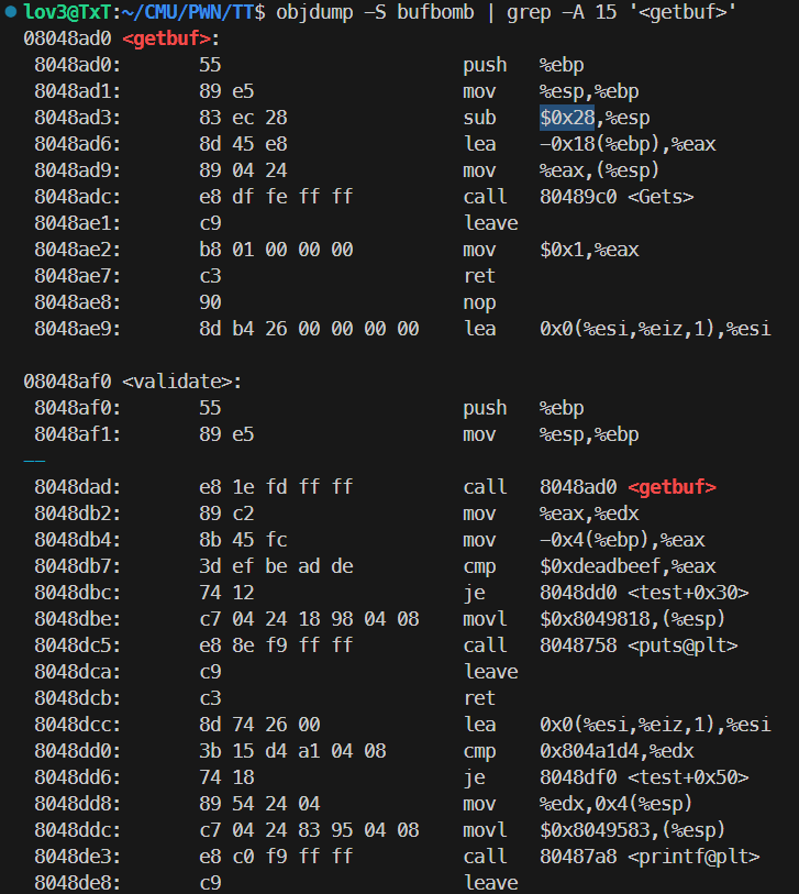 本实验中,bufbomb 中的 test() 函数将会调用 getbuf() 函数,getbuf() 函数再调用 gets() 从标准输入设备读入字符串。